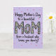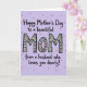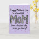 On the front of the card a soft lavender background sets a gentle, affectionate mood, with scattered pink and muted gray circles drifting like light confetti. The main message sits centered, with “Happy Mother’s Day to a beautiful” placed above and “from a husband who loves you dearly!” placed below, both in black flowing lettering that feels tender and close ❤️. In the middle, the large word “MOM” stands out in thick black letters, drawing the eye right away. Each letter is filled with a pale creamy color and decorated with tiny hearts in red, blue, pink, and dark gray, suggesting a loving exchange between partners. Curving green swirls and small round accents weave through the hearts, adding a soft, romantic flourish without cluttering the layout 🌼. The surrounding text frames the center word like a gentle embrace, keeping the focus on the relationship behind the message. The final look shows black text and bold “MOM” centered on lavender, with pink and gray dots scattered across the background.