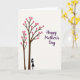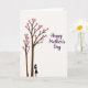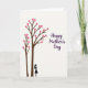 Designed with two slender trees on the left, this illustration sets a calm, romantic tone through gentle shapes and quiet space. The trunks and branches are deep brown, and they’re filled with many rosy-pink, heart-shaped leaves that climb upward like a soft shower of affection ❤️. Near the base of the taller tree stands a single black silhouette of a woman, angled slightly toward the canopy as if admiring it with a tender, unhurried gaze. The roomy off-white background keeps everything airy and lets the hearts feel like they’re floating, adding a subtle sense of closeness and care. In the upper right area, the greeting “Happy Mother’s Day” appears in flowing purple lettering, balanced against the trees on the opposite side 🌼. The text sits high and to the right, leaving open space between the words and the heart-filled branches so the scene feels gentle rather than crowded. The heart leaves vary slightly in size, clustering more densely near the upper branches while a few drift outward toward the center of the card.