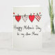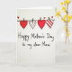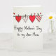 This card features a bright white background with a thin horizontal line near the top, like a little clothesline, where four hearts hang as if gently displayed with tiny clips ❤️. The hearts vary in pattern—one shows red dots on white, another flips that look to white dots on red, a third is solid red, and the last has red-and-white stripes—creating a sweet, friendly rhythm across the page. The simple spacing gives the hearts room to “breathe,” like they’re lined up for someone special to notice each one. Centered below the hearts, the message “Happy Mother’s Day to my dear Mami” appears in dark black lettering that looks casually written, with natural changes in thickness that feel intimate and caring. The text sits in the lower half of the design, leaving the upper area open and airy, and the strong black color stands out clearly against the white. The overall look is light and affectionate, with the hearts seeming to sway in place as if sharing a quiet moment 🌼. Four patterned hearts hang evenly spaced beneath the top line, with the black message centered below them on the white background.