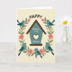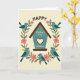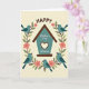 This greeting card features a simple digital illustration with a calm, creamy background and a cozy house-shaped icon in soft teal topped with a warm brown roof. In the middle of the house, a heart-shaped cutout suggests closeness, like a quiet promise shared at home ❤️. Curving around the house is a wreath of twisting branches, dotted with small coral-pink flowers and soft olive-green leaves that feel like early spring 🌼. Four small birds in gentle blue tones sit evenly around the wreath, their relaxed poses and slight head tilts hinting at friendly companionship. The word “HAPPY” appears above the house in uppercase letters, set in a dark, easy-to-read color that stands out against the light background. Inside the house shape, smaller flowing lettering is placed centrally, arranged to follow the space without crowding the heart opening. The blossoms cluster lightly along the upper sides of the wreath, while the birds perch near the left, right, and lower edges of the circular frame.