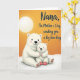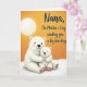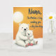This design shows two stylized white bear-like figures cuddled close, with the larger one wrapping its arms around the smaller in a gentle, protective hug that reads as affectionate and family-close ❤️. Their rounded shapes, soft pink cheek blush, and simple smiling faces create a tender, cozy mood without needing extra details. The background is a golden-orange sky, and a pale white glowing circle sits in the upper left like a calm sun or moon, washing the scene in soft light. Beneath them, a bright white ground with faint texture suggests snow, giving a cool contrast to the warm sky. The smaller figure wears tiny red foot coverings, and subtle stitched marks on its paws add a sweet, toy-like touch 🌼. In the upper right, a flowing black message is placed prominently, mentioning a grandmother and a Mother’s Day greeting along with a “big bear hug.” The lettering stays clear against the orange backdrop while the bears remain centered as the main focus. A warm orange field fills most of the card, with the white orb glowing at top left and the black text sitting high on the right.