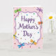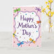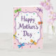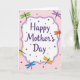 This greeting card features the words “Happy Mother’s Day” centered in flowing purple lettering, set inside a soft white scalloped label outlined in pale lavender. The background is a gentle pastel pink, giving the layout a sweet, affectionate glow ❤️. Around the label and across the pink space, small flying insects resembling dragonflies drift like friendly companions circling a loved one. Their bodies appear in rich shades such as deep red, emerald green, and bright pink, and each one has a tiny heart-shaped head that hints at closeness and care. Their wings shift through cheerful colors like lime green, warm yellow, light blue, and burnt orange, creating a light, fluttering motion. Scattered around the design are uneven polka dots in tones like sapphire blue, ruby red, forest green, and earthy brown, adding a confetti-like sparkle 🌼. The purple greeting remains the focal point, framed by the lavender outline while colorful insects and dots fill the surrounding space. The white scalloped label sits in the middle of the pink field, with dragonfly-like shapes and multicolored dots sprinkled around it.