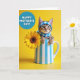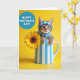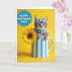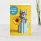 This card shows a small tabby kitten peeking out from a tall ceramic vase with neat vertical stripes, its front paws resting on the rim as if reaching toward someone nearby. The kitten wears a blue-and-white checkered bonnet that frames its wide green eyes, giving it a gentle, affectionate look ❤️. To the right, a large golden-yellow flower opens like a sunny face, with layered petals circling a dark brown, seed-textured center that adds cozy contrast. The background is a smooth, bright yellow field that makes the blues and yellows feel like a warm, friendly exchange between the little cat and the bloom 🌼. In the upper left, a round blue badge holds the message “HAPPY MOTHER’S DAY!” in white uppercase letters. The lettering sits centered inside the circle, standing out sharply against the blue while leaving the main scene open and uncluttered. Soft, even lighting highlights the kitten’s fur texture, the vase’s glossy surface, and the flower’s petal edges against the sunny yellow backdrop.