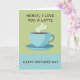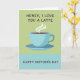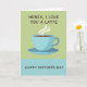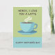 This card features a simple graphic layout split into two wide horizontal bands, with muted olive green on top and calm light blue below. Centered where the colors meet is a stylized cup and saucer in cool blue tones, holding a deep brown drink that suggests a cozy shared moment ❤️. Two curling white steam trails rise from the cup, adding gentle motion like a quiet conversation over coffee. Across the upper green area, a line of uppercase sans‑serif text reads “HONEY, I LOVE YOU A LATTE” in a dark, easy-to-read color. The wording feels affectionate and a little teasing, like partners or close friends exchanging a soft grin across the table. In the lower blue area, “HAPPY MOTHER’S DAY” sits beneath the cup in matching uppercase letters, spaced neatly and aligned to the center. A faint grainy texture lies over the whole design, and a tiny 🌼 detail sits near the bottom edge against the light blue.