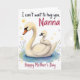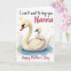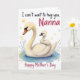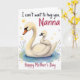 Designed with a gentle illustration of an adult water bird carrying its fluffy chick, the scene focuses on their close bond and calm, shared gaze ❤️. The pair sits centered on a wide white background, giving them lots of breathing room and making their curved necks and soft feathers stand out. The adult bird has a long beak tipped in orange and a relaxed expression, while the chick’s small dark beak and round eye face forward as if trusting the ride. Beneath them, loose blue and green brushy waves suggest a quiet pond surface, adding a peaceful setting without crowding the main figures. Around the birds, small floral touches in lavender and lime feel like gentle decoration, like a garden leaning in to watch. Scattered soft circles in pale yellow and purple float nearby, adding a light, celebratory sparkle 🌼. The message text sits above the birds in two coordinating fonts, with one line in a darker gray and a second line in a softer pastel tone for contrast. Near the lower area, the water ripples fade into the white space with a few lavender leaves and tiny yellow dots drifting along the edge.