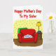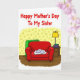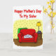 This card shows a cozy living-room corner where a plush cherry-red armchair sits like an inviting hug, with a softly rumpled white cloth on the seat suggesting someone just stood up to greet a loved one ❤️. Behind the chair, a rich emerald-green shape adds contrast and gives the nook a tucked-in, intimate feel, like a quiet space shared between close family or friends. The wall is buttery yellow with lighter, rounded dot patterns that feel like gentle wallpaper texture rather than a flat backdrop. On the right, a simple wooden side table supports a lamp with a bright yellow shade, casting the sense of warm evening light across the scene 🌼. Beneath the lamp, a neat stack of colorful items in green, purple, blue, and pink reads like books or folded linens, hinting at everyday routines done with care for someone special. Across the upper area, the message “Happy Mother’s Day To My Sister” is placed prominently in bold red cursive-style lettering against the yellow wall for easy readability. The floor below is a warm brown, grounding the furniture and keeping the room feeling settled and lived-in. The lamp’s yellow shade sits above the stacked items on the right-hand table, with the red chair centered against the dotted yellow wall.