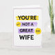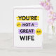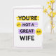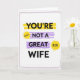 This greeting card features big black letters on a bright white background, arranged in stacked lines so the message reads clearly at a glance. Short yellow and soft lavender marker-like strokes sit behind parts of the lettering, giving the layout a teasing, flirty edge ❤️. A thin, wavy purple line runs near the border like a loose frame, adding a casual, doodled finish. Two round yellow speech-bubble shapes bring in a friendly back-and-forth: one on the left holds the word “what’s,” and the one on the right shows “01%.” The main phrase, “YOU’RE NOT A GREAT WIFE,” sits centered in black, and the contrast between the words and the chatty bubbles makes it feel like an inside joke between close partners. The spacing leaves plenty of white space around the text, so the eye moves from the left bubble to the center message and then to the right bubble 🌼. A thin purple squiggle outlines the edges, while the yellow circles stand out on opposite sides of the design.