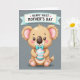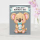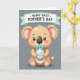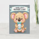 This card shows a cute, human-like marsupial with big fuzzy ears, rosy cheeks, and shiny wide eyes framed by tiny lashes, giving it a tender, friendly look ❤️. Its round, cuddly body is shaded in warm tawny tones, with soft highlights that make the fur feel touchable. The character sits calmly while cradling an egg-shaped object wrapped in pastel stripes of pale pink, light blue, and cream, like a sweet spring treat. A light blue bow rests at its neck, adding a gentle dressed-up touch that feels a bit like showing up for someone you really care about. Above, a cream banner with a soft sky-blue border stretches across the top, holding a congratulatory message in darker lettering with a small star accent near the words 🌼. The text sits centered on the banner, leaving even margins on both sides so the message reads clearly at a glance. Behind everything, the background is a muted gray with horizontal wood-like texture, and the soft lighting creates faint shadows under the character and along the banner edges. Tiny details stand out, like the segmented paw pads and the slight shine on the little nose against the gray grain.