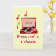 This card shows a friendly, human-like portable music player on a pale yellow background, drawn in a cherry-red case with the lid open like it’s leaning in for a sweet hello ❤️. Inside the lid, a simple face with wide eyes, a small smile, and rosy cheeks gives it a warm, companionable look, like it’s sharing a private joke with the viewer. A black circular disc sits on the turntable with a red center label, and the needle rests nearby as if a song is about to start. In the upper left area, small musical notes float upward in reds, oranges, and golden yellows, adding a soft, affectionate energy to the scene 🌼. Near the bottom, the message “Mum, you’re a classic.” appears in thick crimson letters, centered beneath the player and easy to read. The shapes stay simple with flat color fills and very little shading, keeping the image light and inviting. The overall layout feels balanced, with the notes rising diagonally while the text anchors the lower portion. The red case, black disc, and warm-toned notes stand out clearly against the pale yellow backdrop.