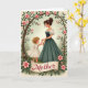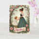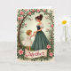 This card shows an adult and a young child sharing a close, tender moment within a leafy arch of branches and pink blossoms 🌼. The adult stands in a period-style outfit with a deep teal bodice, a long dark green skirt, and soft white puffed sleeves, with dark hair neatly arranged. She looks down with a gentle, protective expression, and the child looks up with trusting affection ❤️. The child has golden curls, wears a simple ruffled white dress, and stands barefoot on bright green grass while reaching up to hold the adult’s hand. Soft, diffused light washes the background in pale cream tones, giving the scene a calm, airy glow that makes their connection feel quietly romantic in a family way. Along the bottom, a cream banner holds a single word in dark lettering, centered and easy to spot. Around them, lush green leaves and clustered pink flowers curve overhead like a natural frame, with the blossoms concentrated near the top edge.