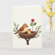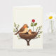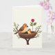 This card features a softly illustrated nature scene framed by a thin, double-line border on a creamy white background. In the center, a tightly woven nest of brown twigs holds a small bird with a light orange chest, nestled in as if enjoying a quiet, caring moment ❤️. Beside it, a larger bird in warm brown and orange tones perches close, its dark eye angled toward the little one in a protective, affectionate way that feels like close friendship. Fresh green leaves sprout from slender tree branches around the nest, adding a gentle springtime setting. To the right, a single deep red rose rises on a green stem, bringing a romantic accent that balances the earthy colors 🌼. The main text sits above the illustration in a soft, dark tone, with a smaller line of text placed below in a lighter shade. Fine shading appears along the birds’ feathers and across the rose petals, with the red bloom leaning slightly rightward.