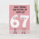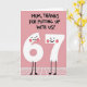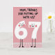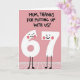 Designed with a soft rose-pink background, this card sets a cozy, family-friendly scene with a wink of humor ❤️. Across the top, dark hand-drawn lettering in all caps reads, “MUM, THANKS FOR PUTTING UP WITH US!”, centered and taking up most of the upper space. Beneath the text stand two white number characters, a “6” and a “7,” posed close together like friendly partners sharing a private joke. Their tiny black dot eyes and curved smiles, plus small pink blush marks on their cheeks, give them an affectionate, slightly bashful look 🌼. Thin black stick legs hold them upright on simple rounded feet, keeping the figures light and easy to read. The limited palette of pink, white, and black keeps attention on the message and the sweet expressions. Along the bottom portion, a faint white grid pattern suggests a floor that the two numbers are standing on.
