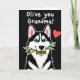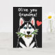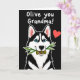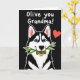 This card shows a stylized black-and-white dog centered on a deep black background, pulling your focus straight to its face. The dog looks forward with bright blue eyes and a gentle, friendly gaze that feels like an affectionate hello ❤️. A thin light outline traces its shape, making the fur pattern and muzzle stand out crisply against the dark setting. In its mouth, it holds a small twig with two green olives, adding a sweet visual joke that reads like a tender offering to a close friend. Near the top, a short line of white text sits above the dog, with the lettering kept airy and easy to spot against the black. A small red heart floats in the upper right area, balancing the layout and echoing the warmth in the dog’s expression. Soft pink shading fills the inside of the pointed ears, and a tiny highlight glints in each eye 🌼.