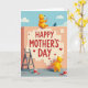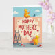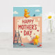 This card shows a soft peach-pink wall beneath a wide blue sky with fluffy white clouds, setting a calm, sunny scene 🌼. Near the top sits a cream-colored plaque with “HAPPY MOTHER’S DAY” centered in bright red letters, with small red hearts sprinkled around it ❤️. Two rounded yellow, bear-like figures work together at the wall, and their close positions and gentle smiles suggest a sweet, caring bond. The larger figure sits on the top edge, rosy-cheeked and content, holding a paintbrush as if finishing the last careful strokes. Below, the smaller figure stands on a cool gray-blue ground, brush lifted toward the sign like it’s proudly helping. A tiny blue bird with an orange beak perches nearby on the wall’s edge, watching the teamwork. Scattered red heart cutouts and open paint cans in matching red sit in the foreground, with a sturdy gray stepladder leaning against the wall.