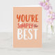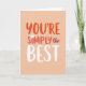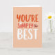 Designed with a soft, muted peach background, this card keeps the focus on the centered phrase “YOU’RE SIMPLY THE BEST” like a sweet note shared between close friends ❤️. “YOU’RE” sits at the top in rounded coral-orange letters, and a small white heart replaces the apostrophe for a gentle, affectionate touch. Just beneath it, “SIMPLY” follows in a slightly deeper reddish-coral, keeping the layout tidy and easy to read. The small word “the” appears next in a thin, flowing reddish-brown style, adding a quiet, tender contrast. “BEST” anchors the bottom in larger rounded white letters, giving the message a confident finish without feeling harsh. Each word has a faint shadow that makes the lettering lift slightly from the background, like it’s softly floating. The warm coral tones against peach create a cozy, caring look that pairs nicely with a small 🌼 tucked into a note or gift. The white heart-apostrophe is crisp and centered within the first word, standing out clearly against the coral-orange text.