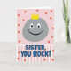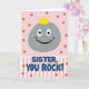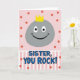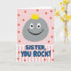 This card shows a split layout that feels like a friendly shout-out, with a rounded gray rock-like character floating in the top half and smiling warmly as if sharing a private joke with someone close ❤️. Its simple white eyes with black pupils and a wide grin give it an easy, affectionate charm, and a small bright yellow crown sits on top like a sweet nod of admiration. The background behind the character is soft pink, sprinkled with coral-red dots that drift downward like confetti, adding a light, celebratory mood. A horizontal section below switches to pale pink and white vertical stripes, creating a neat stage for the message. Centered on the striped area, the text reads “SISTER, YOU ROCK!” in medium blue letters with a thin black outline, standing out clearly against the lighter bands. A few coral-red dots continue between the top and bottom sections to tie the two areas together, like little shared moments between friends 🌼. The crown is a bright yellow accent above the smooth gray shape, set against the pink field dotted with coral-red circles.