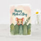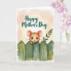 Designed with a soft watercolor look, the card centers on a small furry creature with oversized, expressive eyes and pale pink ears, leaning over a rustic moss-green wooden fence as if reaching out for a gentle hello ❤️. Its tiny paws rest on the uneven planks, and the curious tilt of its head gives the scene a tender, affectionate energy. A simple sprig of fresh green leaves rises on the right side, like a quiet little gift tucked into the frame 🌼. Across the upper area, the words “Happy Mother’s Day” sit prominently in flowing deep teal lettering. Behind everything, a light wash of blush pink and pale yellow spreads across the background, softly fading at the edges. Subtle texture suggests fluffy fur, smooth ear contours, and painterly greens in the fence that feel naturally imperfect. The overall composition leaves plenty of airy space around the main figure, keeping the focus on the sweet gaze and gentle pose. The fence shows layered green tones with faint wood-grain marks, and the leaf sprig has small rounded leaves with lighter highlights near the tips.