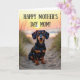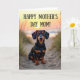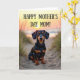 This card shows a short-legged companion dog with a glossy black-and-tan coat sitting alert on a sandy path, gazing forward with big, tender eyes that feel like a quiet ❤️ “I’m here with you.” Soft blades of grass edge the path, leaning slightly as if sharing the moment alongside the pup. The background is softly blurred, with warm golden-hour light wrapping the scene like a gentle hug between close friends. A pale sun disk hangs low behind the dog, casting a honey-colored glow that catches the shine in its eyes and the smooth fur along its face. Centered near the top, the message “HAPPY MOTHER’S DAY MOM!” appears in decorative lettering, standing out clearly against the light sky. The text is arranged in a single, prominent line above the dog, leaving open space around it so the words feel airy and easy to read. The overall color palette stays warm with sandy beige, soft gold, and muted green, giving the scene a calm, caring mood 🌼. The dog sits squarely in the lower center, with the sun softly glowing in the upper background and grass framing both sides of the path.