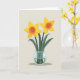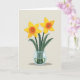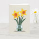 This card features a retro, pixel-style still life that feels sweet and a little nostalgic, like a small gift shared between close friends ❤️. Two star-shaped yellow flowers take center stage, each with a ruffled orange cup that looks like it’s glowing. Their slim green stems rise together as if leaning in, surrounded by curved emerald leaves that suggest a gentle, companionable closeness. The bouquet sits in a small round glass vase with a faint blue tint, showing the stems below the surface through pale green water with tiny light specks. A muted beige background keeps the focus on the flowers, while soft lighting casts a long, quiet shadow beneath the vase. Near the top, the message “Happy Mother’s Day” appears in a simple dark green font, centered and easy to read, with a small 🌼 accent nearby. The glass rim is outlined with light blue pixels, and the shadow stretches slightly to the lower left on the beige backdrop.