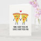 This card shows two friendly, human-like slices of a savory baked treat standing together on a plain white background, their golden-yellow faces dotted with small red circles and topped with a toasted brown crust. Thin black stick arms and legs give them a light, animated look, and their hands meet in the middle in a gentle clasp that reads like a caring, close bond. Each slice has tiny dot eyes and a wide, curved smile, as if they’re sharing a private joke and enjoying the moment ❤️. A small red heart floats above their joined hands, adding a romantic, affectionate touch to the simple scene. Centered below the characters, an all-caps message reads “MOM, EVERY PIZZA ME LOVES EVERY PIZZA YOU,” drawn in thick black lettering. The text sits low on the card with plenty of white space around it, keeping the focus on the pair and their sweet connection 🌼. The red toppings and heart stand out sharply against the warm yellows and browns, while the background stays bright white with no extra objects or scenery.