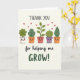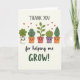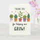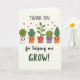 This card shows a horizontal row of five cute potted plants with little faces, lined up like close friends sharing a quiet moment together ❤️. Each pot is a different gentle color—white, warm clay, soft coral, and light lavender—while the plants above them range from rounded leafy tufts to a curled sprout and a single tall leaf in rich greens. Their wide eyes and rosy cheeks give them tender, companionable expressions, as if they’re looking out for one another. Small red hearts float upward above the plants, adding a soft romantic touch without taking over the scene 🌼. At the top, the words “THANK YOU” sit centered in a simple, friendly font in a dark tone that stands out clearly. Along the bottom, “for helping me GROW!” stretches across the width, with “GROW!” in deep green to mirror the leaves. The background is a light cream field with plenty of open space, and the hearts appear as tiny ruby shapes scattered above the row of pots.