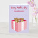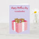 This card features a soft lavender background with faint, see-through star outlines scattered across it 🌼. Near the top, the text “Happy Mother’s Day” appears in flowing scarlet lettering, with “Grandmother” set just below it in a darker, steady style. In the lower half, a pink gift box sits centered, decorated with slim white vertical stripes dotted with tiny gray circles. Golden outlined stars add a gentle sparkle around the box, like little hints of celebration. Three small brown plush figures peek out together, their simple black button eyes and tiny snouts giving them a sweet, affectionate look as they lean close like close friends ❤️. The middle plush holds a small purple flower with a green stem, offering it forward as if sharing a quiet, caring moment. The gift box lid frames the trio, and the soft star shapes in the lavender background continue behind them.