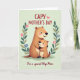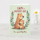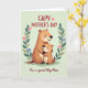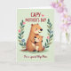 This card features two big, friendly brown-furred animals cuddling close, with the larger one gently holding the smaller as they share a tender, contented smile ❤️. Their rounded shapes are shaded with soft gradients that make them look plush, and both have rosy cheeks that add to the affectionate mood. A curved wreath of leafy greenery frames them like a hug from the background, dotted with small five-petaled flowers in light pink and calm blue 🌼. The setting is a pale sage green backdrop that keeps everything soothing and uncluttered. Near the top, the main message “CAPY MOTHER’S DAY” appears in rich red letters, with a tiny heart placed nearby. Under the pair, a smaller line in flowing cursive reads “For a special Step Mom,” set in a darker tone that stays easy to read. The flowers sit evenly around the arch, with pink and blue blossoms tucked between layered green leaves.