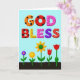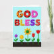 This greeting card features a digital illustration with the large, two-line text “GOD BLESS” centered near the top in plump, three-dimensional letters that feel as sweet and friendly as shared treats ❤️. The words sit on a soft cerulean-blue background, giving the message plenty of open space to breathe. Each letter has its own decorative pattern: warm orange and deep red letters carry black polka dots, while sunny yellow and pink letters are sprinkled with tiny red specks like confetti. A deep purple letter is dotted with darker flecks, and the final red “S” stands out with thin white stitched-style lines that suggest care and closeness. Beneath the text, a dark brown strip of ground stretches across the bottom, like a simple garden bed ready for a small celebration. From this soil rise five stylized flowers on slender green stems, their shapes leaning toward one another in a gentle, companionable way 🌼. The flowers include a small purple bloom with a golden center, a bright orange flower, a larger yellow sun-like blossom, and two red tulip-shaped flowers against the dark earth.