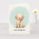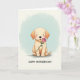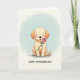 This card features a light-golden puppy standing upright in the center, gazing forward with big dark eyes and softly blushed cheeks that suggest a sweet, affectionate shyness ❤️. Its rounded little paws gently hold out a single pink rose, as if offering it to a close friend or someone it adores, with the green stem and leaves clearly visible. Warm, gentle lighting smooths the fur’s soft edges and adds a cozy glow to the scene. The background looks like a cloud-soft blend of pale blue and creamy ivory, giving the moment a calm, dreamy setting. A faint shadow under the puppy anchors it without making the scene feel heavy. Near the bottom, a short message is placed beneath the illustration in a casual, hand-drawn style, colored in a darker tone that stands out against the light backdrop 🌼. The rose is a soft pink bloom with a bright green stem and two small leaves, held close to the puppy’s chest.