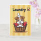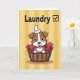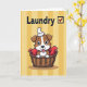 This greeting card shows a cute puppy-like cartoon animal with brown-and-white markings, big curious eyes, and a tiny tongue peeking out as it snuggles into a tightly woven basket. A rich red cloth wraps around it like a cozy nest, and the little pup’s gentle, trusting look adds a sweet, affectionate tone ❤️. Balanced on its head is a neatly folded white cloth, like it’s trying to help with chores while still wanting a cuddle. Behind the basket, the background is filled with warm horizontal stripes in golden yellow shades that feel sunny and homey. Near the top, the word “Laundry” appears in dark lettering, set clearly above the illustration. Next to the word is a small red checkered box, like a task list mark that humorously frames the pup as the “helper” 🌼. The basket sits centered on the page, with the red fabric folds visible around the animal and the yellow stripes stretching across the entire background.