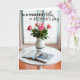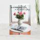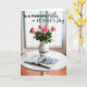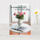 This greeting card shows a calm indoor scene with a white round table holding a white vase with a thin dark band, filled with soft pink flowers and fresh green leaves ❤️. Nearby, an open magazine lies on the tabletop, and a pair of speckled eyeglasses rests across the pages as if someone just looked up with a gentle, affectionate pause. Soft daylight filters in from a window behind the table, and the white slatted blinds create faint lines of light and shadow across the background. A pale blue edge along the window frame adds a cool, soothing touch, while the floor below reads as warm terracotta. Across the upper half of the design, a large message about Mother’s Day is set in dark lettering, with the main line centered and smaller words arranged above and below it. The overall layout feels like a quiet shared moment, the kind where care shows in what’s been set out and left waiting 🌼. The open magazine, the speckled glasses, and the softly lit blinds sit just behind the vase on the bright white table.