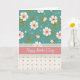 Designed with a three-tier layout, this Mother’s Day card uses soft teal, blush pink, muted green, and creamy tones to create a gentle, affectionate look ❤️. The top section shows a teal background filled with large white flowers that have pink centers and tiny red details, surrounded by olive leaves and smaller pale blossoms that feel like they’re leaning toward one another. Small scattered accents and light shadowing add depth, like the blooms are floating slightly above the surface. A thin white lace-like strip separates the top from the middle, leading into a salmon-pink band that draws the eye to the message. Centered on that pink band, “Happy Mother’s Day” appears in bright white lettering, standing out clearly against the warm color. Another matching lace-like strip frames the lower section, where a cream panel is patterned with soft pink dots, teal clover-like shapes, and sage floral icons 🌼. The bottom pattern repeats evenly across the cream background with tidy spacing and gentle pastel contrast.