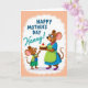 This card shows two friendly, rodent-like characters sharing a sweet moment, with an adult female figure centered in the scene wearing round glasses, a pink beaded necklace, and a green apron over a blue outfit ❤️. She holds out a frosted cake topped with one red strawberry, angled slightly toward her smaller companion as if offering it with gentle care. The younger character stands close at her side in a striped shirt and green shorts, looking up with bright, eager eyes and one paw reaching toward the treat. A soft peach border frames a white background, giving the scene a cozy, kitchen-like warmth without showing specific furniture. Near the top, a large seasonal greeting appears in thick, festive letters, set in a darker color that stands out clearly against the light space. The warm tones and close body language suggest affection and togetherness, like a shared tradition between family or close friends 🌼. Small details, including their curled tails and the glossy strawberry on the cake, are drawn in crisp lines against the pale center panel.