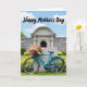 This card shows a teal bicycle resting against a simple gray stone pillar, its cool frame standing out against the calm, old-world setting. A front basket overflows with roses in soft pink, sunny yellow, and deep red, like a sweet surprise left for someone special ❤️. In the foreground, rich green grass stretches across the scene, sprinkled with small yellow flowers that echo the warm tones in the bouquet 🌼. Behind it, a gray stone wall guides your eye toward a stately building with an arched doorway, suggesting a quiet garden walk and an affectionate visit. Gentle sunlight and a bright blue sky with scattered white clouds keep everything airy and welcoming. The words “Happy Mother’s Day” appear across the upper sky in a flowing dark teal style, centered and easy to spot. The bicycle’s sturdy shape beside the soft petals creates a tender contrast, like a caring gesture waiting to be noticed. The basket sits just above the front wheel, packed tightly with blooms that spill slightly over the rim.