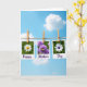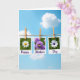 This card shows three rectangular photo-style prints hanging from a twine line with small wooden pegs against a bright blue sky dotted with soft white clouds. The background is gently blurred so the hanging prints feel close and intimate, like little keepsakes shared between loved ones ❤️. On the left print, a white flower with a sunny yellow center sits on a soft green backdrop, and the word “Happy” appears below it in deep purple lettering. The middle print features a round cluster of tiny purple blossoms, where a small yellow winged insect with darker markings rests lightly on a petal, adding a quiet, tender moment. Beneath that image, “Mother’s” is written in the same deep purple lettering, centered under the photo. On the right print, another white flower stands out with an indigo-purple center against leafy green, and “Day” is placed below in matching deep purple text with a little 🌼. All three prints hang evenly spaced, their edges crisp against the airy sky and cloud streaks behind them.