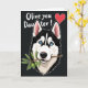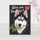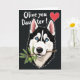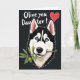 This card features a stylized black-and-white snow dog’s head centered against a deep black background, edged with a thin white outline that makes it stand out. Its sky-blue eyes draw you in with a tender, friendly gaze that feels like it’s meant for someone close ❤️. The dog holds a small olive branch in its mouth, adding a gentle “making peace” gesture that reads like a sweet nudge toward affection. The branch shows bright green leaves and two olives, bringing a fresh natural touch against the darker fur and backdrop 🌼. Near the top, white cursive-style lettering stretches across the space with a loving message, and a small red heart sits alongside the words. The text stays high and clear, leaving the dog’s face unobstructed as the main focus. Fine linework keeps the fur markings sharp while the limited color palette makes the eyes and greenery feel even more intimate. The final detail is the olive branch angled slightly upward from the dog’s mouth, with two olives nestled among glossy green leaves.