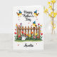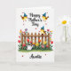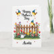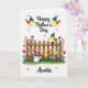 This card features a cheerful spring garden scene on a bright white background, with a gentle, affectionate mood shown through smiling little birds and scattered heart shapes ❤️. Near the top, the phrase “Happy Mother’s Day” appears in dark lettering, flanked by two round yellow birds with small brown wings and blue cone-shaped party hats. Their close, side-by-side placement feels like a friendly pair leaning in together, as if sharing a sweet moment. Across the middle, a warm-toned wooden picket fence runs horizontally, creating a cozy boundary for the flowers behind it. Red and orange tulips, yellow and pink daisy-like blooms, and other colorful petals rise from thick green grass, giving the garden a lively, caring look 🌼. A third matching bird, also wearing a blue party hat, sits on the fence like a watchful companion enjoying the view. A white watering can with blue bands rests among the plants, while small red hearts dot the scene, and “Auntie” is written at the bottom in dark text.