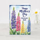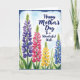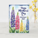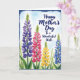 This card features a watercolor-style garden scene with four tall flower spikes rising close together, like friends leaning in for a photo ❤️. Bell-shaped blossoms cluster along each stem in deep purple, bright pink, sunny yellow, and soft blue, with gentle shifts in tone that make the petals look tender and alive. The green stalks gather at the bottom and guide your eye upward, giving the layout a light, uplifting rhythm. Behind them, a wide sky-blue wash fills the background, airy and calm, like a quiet morning outdoors 🌼. In the upper right, a short greeting appears in dark blue lettering, leaving plenty of open space around it so it feels airy rather than crowded. A thin, textured dark blue border runs around the edges, slightly uneven like a painted frame. The flowers show feathery edges and translucent layers, with tiny touches of indigo and golden tones tucked between the bell shapes. The border’s dark blue paint looks lightly brushed, with small breaks and thicker patches along the corners.