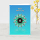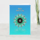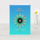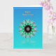 Designed with a smooth gradient background that shifts from cerulean blue at the top to aquamarine near the bottom, this card feels like open sky meeting calm water. In the lower middle sits a geometric flower-like starburst with a deep black center sprinkled with tiny white dots, like two close hearts sharing a quiet moment ❤️. Twelve teal segments radiate outward, each edged in white with a thin dark outline that adds gentle depth and structure. Around the main burst, smaller pale-teal teardrop shapes and fine white lines drift outward, creating a soft sense of closeness and connection, like friends leaning in toward one another 🌼. Near the top, a golden-orange message appears in slightly raised lettering, centered and easy to spot against the cool background. A thin white border frames the entire design, keeping the layout neat and balanced. Beneath the starburst, a faint mirrored reflection sits on the lower aquamarine area, as if the shape is hovering above a still, glassy surface.