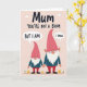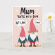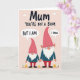 Designed with two stylized, bearded figures at the center, this illustration places a taller character and a smaller companion against a soft blush-pink background as they hold hands ❤️. Both wear red cone-shaped hats, teal-blue tunics, and long white beards, and their closed eyes and slight smiles suggest a tender, teasing closeness. Small white starburst shapes and tiny clouds float around them, keeping the scene light and airy. Along the bottom edge, simple yellow and white flowers create a gentle ground line, like a small garden under their feet 🌼. The main text sits prominently across the upper and middle area in dark lettering and reads, “Mum YOU’RE NOT A BUM BUT I AM.” The words “BUT I AM” appear inside a speech bubble pointing toward the smaller figure, while a second speech bubble near the taller figure replies, “I KNOW,” in matching dark text. Subtle shading adds depth to the hats, tunics, and beards, and the background remains softly pink with scattered white bursts and clouds.