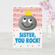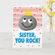 This card shows a rounded, stone-like character in mottled gray at the center, wearing a bright yellow crown that gives it a proudly affectionate look ❤️. Its big white eyes with black pupils glance upward as if admiring someone nearby, and a wide black-outlined smile makes the expression feel friendly and close. A tiny “x” mark sits between the eyes, adding a small, quirky detail that makes the character feel more companionable. Across the top half, soft horizontal stripes alternate pink and white, sprinkled with scattered red dots that feel like confetti floating through the air. The lower half shifts to a plain white field where the message “SISTER, YOU ROCK!” is placed prominently in strong blue letters. The text sits below the character like a cheerful shout-out, while a few red dots drift down into the white area to keep the layout connected 🌼. The crown’s yellow stands out sharply against the gray figure and the pink-and-white striped background. Red polka dots are scattered across both the striped top and the white bottom, with the blue message centered in the lower section.