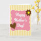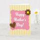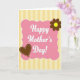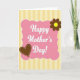 This card features a soft, welcoming background of pale yellow and cream vertical stripes that feels sunny and calm 🌼. Centered in front is a large, irregular rose-pink panel with a thin white outline, like a gently floating cloud. Across this pink shape, a flowing white message sits prominently, easy to read against the muted color. The overall layout feels affectionate, as if the design is leaning in close to share something sweet ❤️. In the upper right corner, a simple four-petal flower adds contrast with deep brown petals and a bright yellow center. In the lower left, a dark brown heart with a dashed white outline suggests careful stitching and tender attention. The text stays contained within the central pink panel, while the flower and heart balance the corners without crowding the stripes behind them. The final look includes the striped backdrop, the rose panel in the middle, the flower near the top right, and the stitched-look heart near the bottom left.
