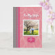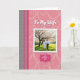 This greeting card features a moody charcoal-gray section on the left with a light dotted texture, set beside a tall fuchsia strip that adds a bright accent. The right side opens into a blush-pink field with airy swirling patterns that feel soft and romantic ❤️. Centered on the front is a photo framed by a scalloped white border, drawing your eye straight to a quiet scene of togetherness. In the photo, a couple is seen from behind walking hand-in-hand across a sunlit green lawn, their closeness shown in the gentle way their arms fall toward each other. Above the photo, a short line of white lettering sits near the top edge, while below it a decorative fuchsia label holds a second line of text in a lighter color. A flowering tree stretches overhead with dark branching limbs and clusters of pale blossoms, with warm golden light glowing through the leaves 🌼. The background shows a wide sweep of green grass beneath the blossom-filled canopy, with the couple placed slightly below center in the framed photograph.