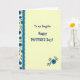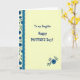 This card opens to a soft, creamy yellow interior that feels gentle and welcoming, like a quiet hug ❤️. Centered on the page is the message “To my Daughter Happy MOTHER’S Day!”, arranged in stacked lines so the greeting reads clearly at a glance. The first part of the wording appears in a flowing, casual cursive style, while “MOTHER’S Day!” stands out in a thicker, simple letter style for emphasis. Along the left edge runs a vertical border of blue daisy-like flowers linked by thin green vines, adding a sweet, caring touch 🌼. Just inside that floral strip is a teal-blue panel with a scalloped edge, giving the layout a soft, decorative frame. A matching flower cluster with green leaves sits at the bottom right corner, balancing the design like a small bouquet placed there for someone special. The blue blossoms are evenly spaced up the left side, and the teal panel forms a neat vertical band beside them.