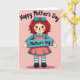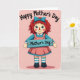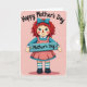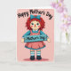 This card shows a textile-style doll standing centered on a soft blush-pink background with a lightly brushed texture, like an old-fashioned card. The doll faces forward with a sweet, steady gaze, rosy cheeks, and a tiny red nose that gives it a gentle, affectionate look ❤️. Fiery red yarn-like hair falls around its face and is held back with a teal bow that matches the cool tones in its outfit. It wears a teal long-sleeved top with a white collar and a salmon-pink pinafore dress trimmed with a white scalloped edge, while teal-and-white striped socks peek above simple dark shoes. Across the doll’s chest sits a teal rectangular sign held in place with small gold-toned studs, and the words “Mother’s Day” appear in dark lettering on the sign. Near the top, the phrase “Happy Mother’s Day” curves in an arc across the upper area in dark text, leaving airy space around it for a calm, tender feel 🌼. The overall palette blends blush pink, teal, salmon, and white, with the teal sign and bow standing out against the softly textured background. The sign is centered over the doll’s torso, and the upper text arches neatly above its bright red hair and teal bow.