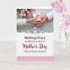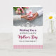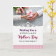 This greeting card features a tender scene in the upper half where two sets of hands meet over a white gift box wrapped with a soft pink ribbon tied into a neat bow, suggesting closeness and care ❤️. One hand reaches out from a cream knit sleeve while the other extends from a white shirt cuff, creating a gentle contrast that feels like a warm exchange between loved ones. Behind them, fresh tulips in pale pink and creamy white cluster together, their green stems resting against a lightly mottled gray surface for a calm, homey setting. A delicate white scrollwork border separates the picture from the message area below, adding a lace-like touch. Centered in the lower section, the text reads “Wishing You a BLESSED & HAPPY Mother’s Day” in rich purple and deep magenta, with “BLESSED & HAPPY” standing out in larger lettering. Beneath that, “FULL OF PEACE AND JOY!” appears in a simpler style, also centered, with spacing that keeps the layout airy and easy to read 🌼. Along the very bottom edge, a soft pink-and-white gingham pattern forms a cozy band under the words.