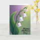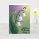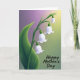 This design shows a serene spring scene with a drooping cluster of white, bell-shaped flowers hanging along the left side, like a gentle gesture of care ❤️. Each blossom is softly shaded with faint purple tones, giving the petals a tender, almost see-through look that suggests closeness and quiet affection. A wide, curved leaf in layered greens sits beneath the blooms, grounding the arrangement as if it’s leaning in protectively. Behind it all, the background shifts in smooth gradients from a warm yellow glow in the upper right to a light lavender haze toward the upper left, then into a muted green near the bottom. The lighting feels like early morning, with soft highlights and mild shadows that keep everything calm and intimate 🌼. Near the bottom right, the words “Happy Mother’s Day” appear in dark lettering, small enough to let the flowers lead while still being easy to notice. The text sits just above the lower edge, aligned toward the right, with the yellow-to-green background creating gentle contrast around the letters. The left-side blossoms cascade downward beside the green leaf, while the warm yellow corner glows above the message.