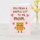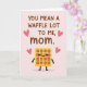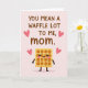 This card features a cute, human-like breakfast pastry with a grid pattern, colored golden yellow with warm brown edges, sitting across the lower half of the design. Its closed eyes and rosy cheeks give it a shy, affectionate look, like it’s quietly sharing a sweet moment ❤️. The background is a soft pale pink that keeps the scene gentle and cozy without distracting from the main figure. Across the upper area, rounded brown text reads, “YOU MEAN A WAFFLE LOT TO ME, MOM,” arranged in an easy-to-read layout above the character. Small pink hearts float around the words, adding a romantic, caring tone as if the message is surrounded by hugs 🌼. The hearts have slight shading that makes them look softly raised, and their placement helps guide your eye from the text down to the pastry’s face. The pastry’s simple smile and blush details create the feeling of a warm bond, like a tender thank-you shared between family. Four pink hearts sit near the top and sides of the lettering, framing the phrase against the pale pink background.