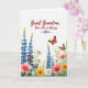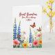 Designed with a gentle, watercolor-like garden scene, the card places a loving message across the top in flowing crimson lettering ❤️. Beneath the words, a lush spread of greenery and wildflowers fills the lower half, creating a cozy, close-knit feel like a shared walk outdoors. Tall blue flower spikes rise on the left and near the center, their stacked petals forming neat vertical lines among the softer blooms. Around them sit sunny yellow flowers with strong centers, soft pink wide-petaled blossoms, and scattered white daisies with golden middles 🌼. Several orange-and-black winged insects add motion, some resting lightly on petals while others hover as if drawn to the flowers like friends finding one another. One butterfly stands out with purple-and-white markings, offering a sweet contrast to the warmer orange tones nearby. The background stays mostly white and fades into a faint light green wash along the bottom edge. The crimson text sits above the floral band, while the base shows a pale green gradient beneath the stems and leaves.