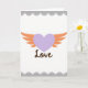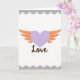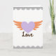 This greeting card features a soft white background with a lavender heart centered like a gentle token of closeness, with a quiet, romantic feel ❤️. Warm orange-peach wings extend from each side of the heart, as if lifting it upward and suggesting an embrace shared between two people. Just below the heart, the word “Love” sits centered in dark brown, written in flowing cursive-style lettering that feels tender without being loud. The darker text stands out clearly against the pale colors while keeping the overall look calm and sweet. Along the top edge, a muted gray decorative border forms scalloped, lace-like details that add a cozy, old-fashioned touch. A matching gray border echoes the same pattern along the bottom edge, framing the design like delicate trim 🌼. The wings show soft curves and feather-like shapes, and the gray borders include small flourishes and scallops at both the upper and lower edges.
